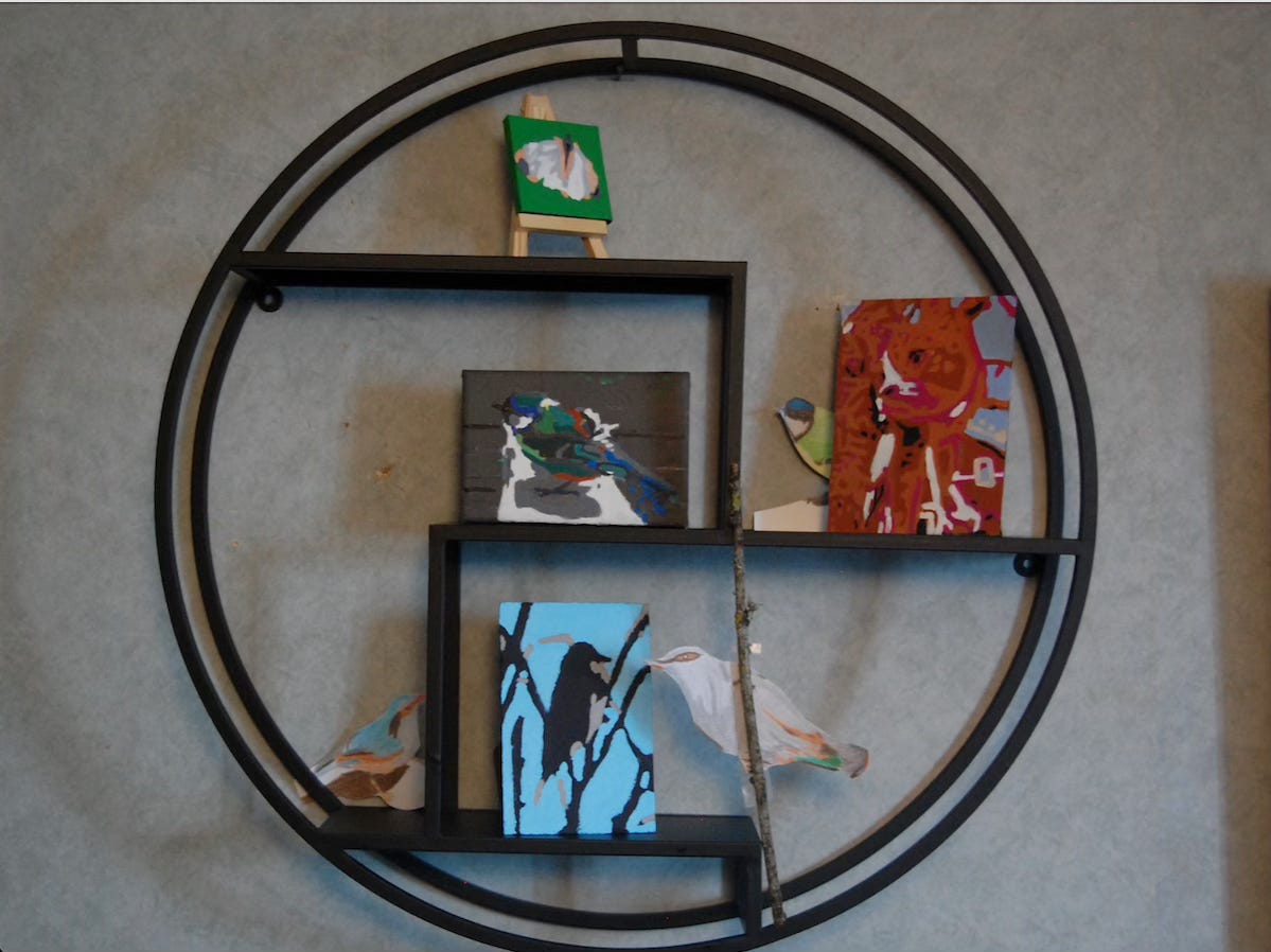 The artwork to the right is of a cat in a tree with a house in the background. This was made on some leftover scrap wood I had laying around, and then I used five different acrylic paints for the whole piece. The middle bird is the only canvas in the picture; it’s made with lower-quality acrylic paint. It’s originally captured from a close-up photograph one winter day, the background being that of a porch.
